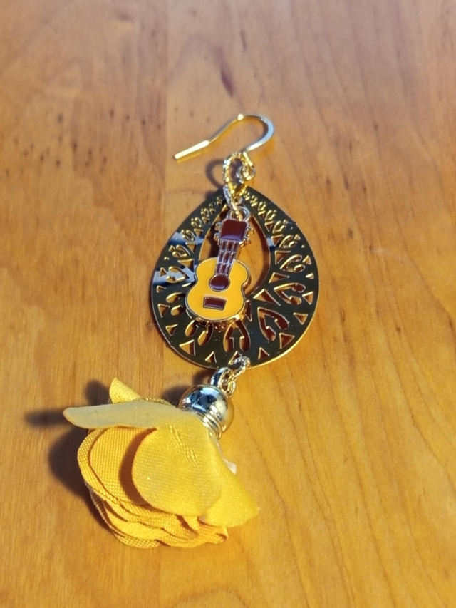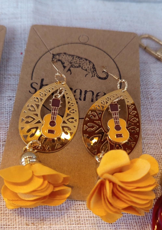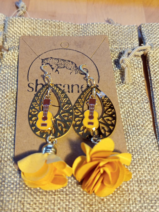Leur pendentif en forme de larme ajourée en acier inoxydable doré capte délicatement la lumière. En son centre, une guitare dorée émaillée apporte une touche artistique et originale, tandis que le pompon fleur, délicat et féminin, donne du mouvement et illumine le visage.