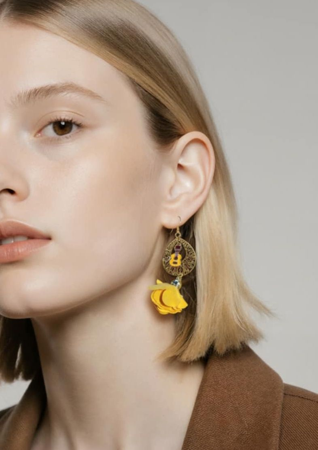 Laissez-vous séduire par les boucles d’oreilles Pushpa Gita, une création lumineuse et poétique où la fleur rencontre la musique.