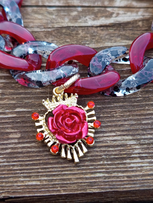 Pendentif : cœur couronné, délicatement orné de strass rouge couleur siam et de fleurs roses, en alliage de zinc, 30 × 23,5 × 8,5 mm