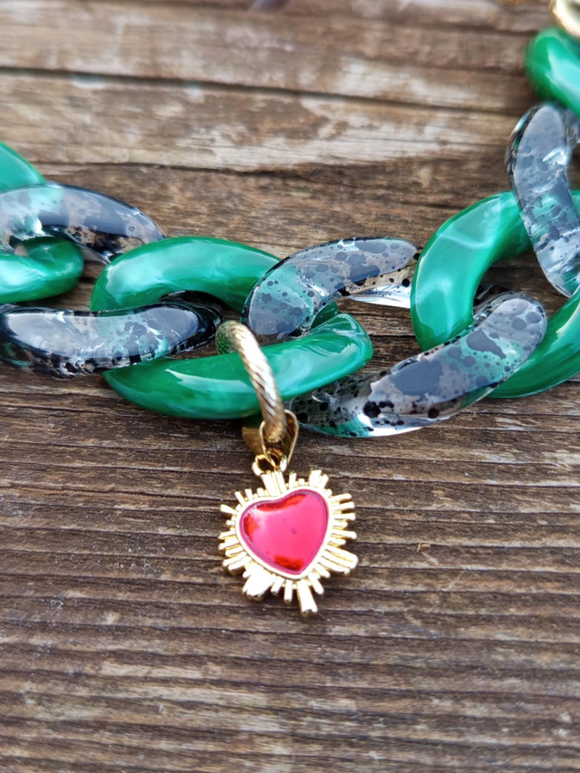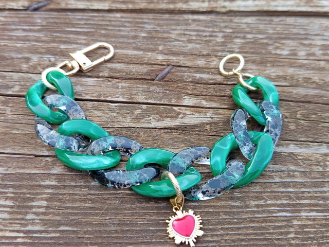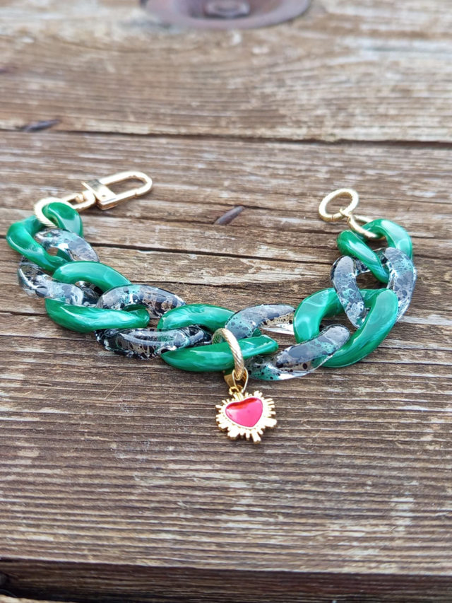 Le bracelet Mantrika célèbre l’alliance du caractère et de la douceur. Composé de 9 maillons ouverts en acrylique, il alterne des nuances vert marbré profond et transparent tacheté de noir, pour un contraste visuel audacieux et raffiné.