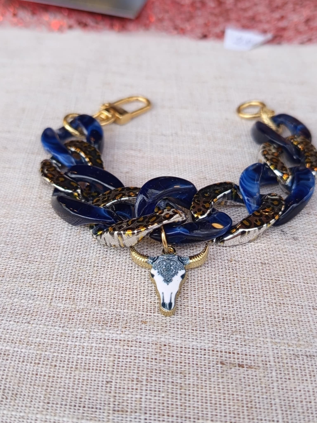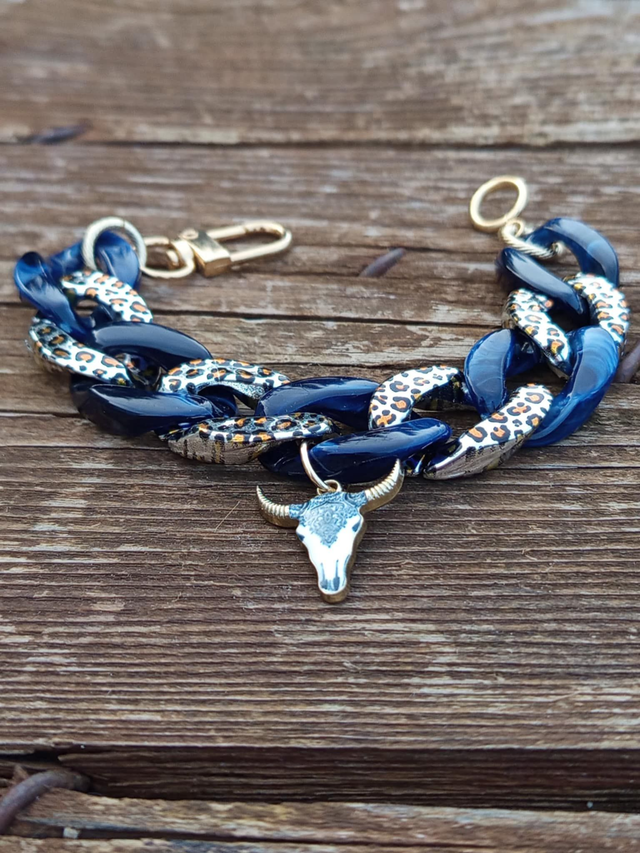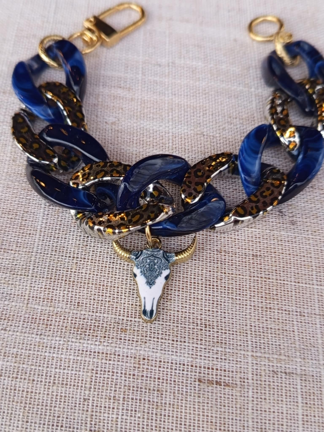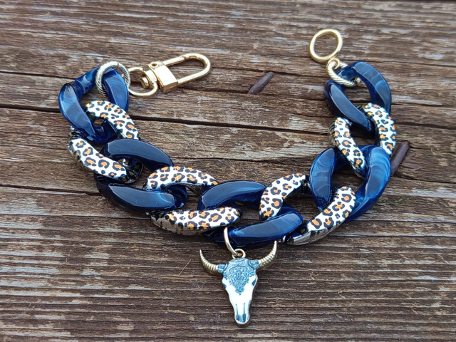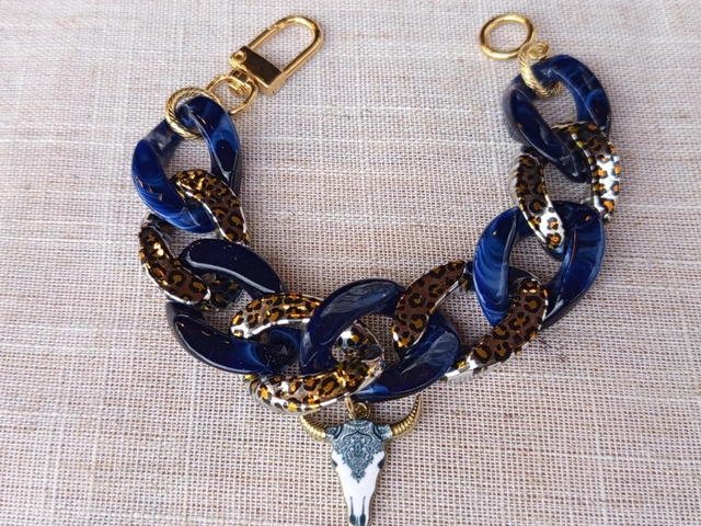 - 9 maillons ouverts en acrylique brillant, aux nuances bleu nuit marbré, léopard doré, argenté et marron, pour un jeu de textures captivant