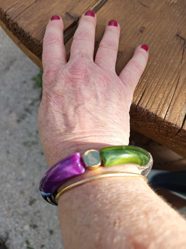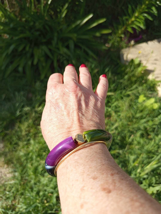 🌈 6 perles incurvées en acrylique : aux couleurs vibrantes — violet profond, vert émeraude, bleu nuit et cristal paillettes or — captant la lumière avec élégance.