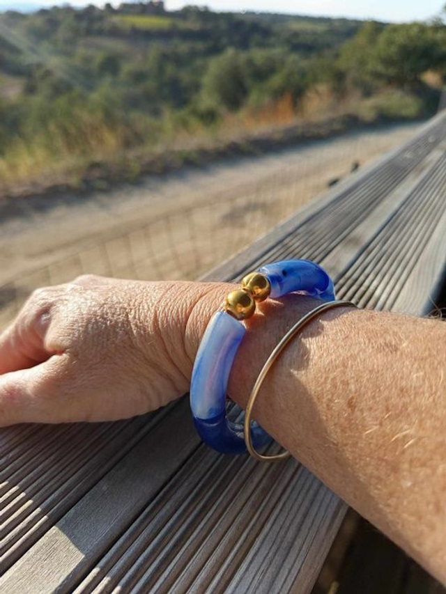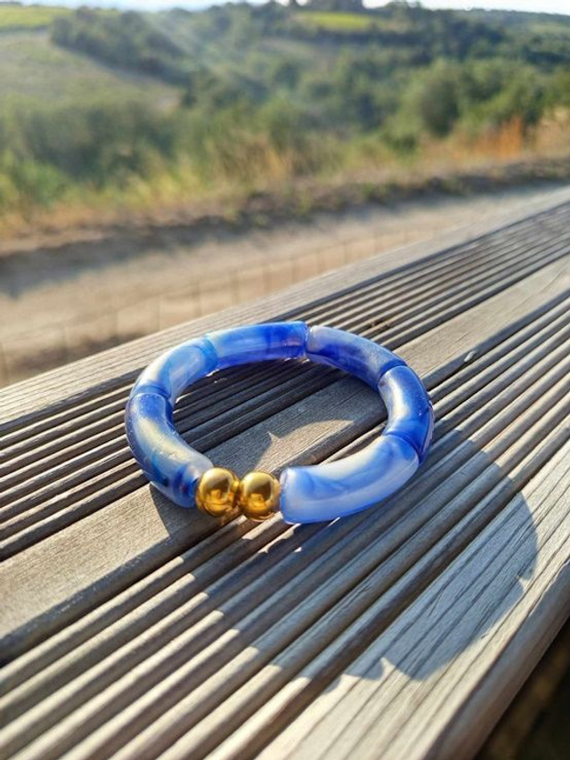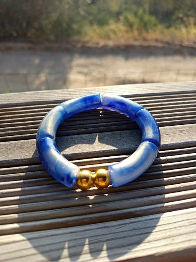 Bracelet perles tubes incurvées acryliques marbrées Khazaana bleu foncé