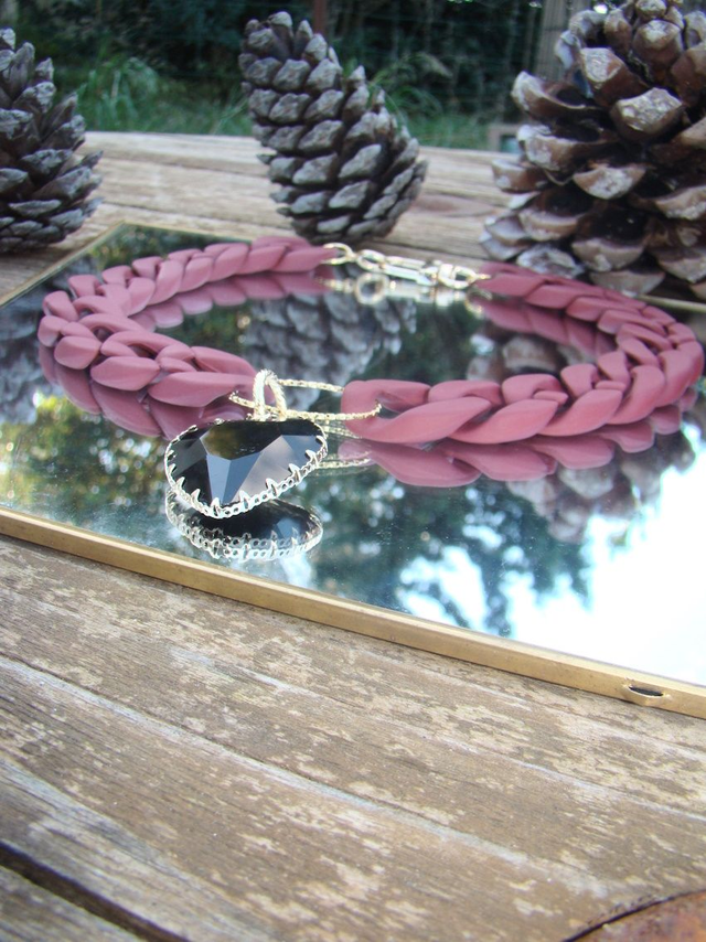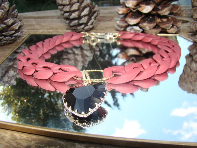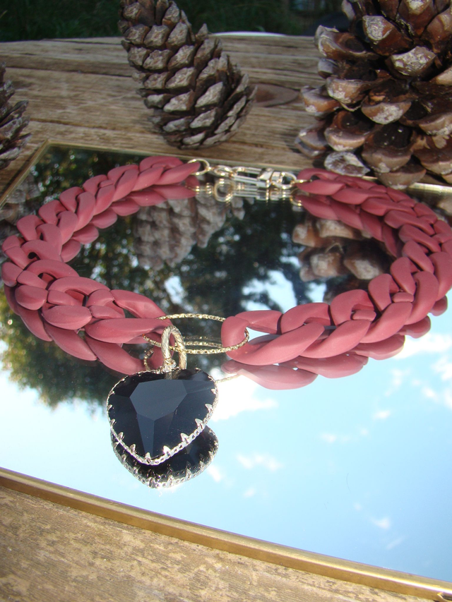 Son pendentif cœur en verre noir est délicatement souligné d’un contour en laiton doré, apportant une touche lumineuse et précieuse. Le contraste entre le rouge intense du collier et le noir du cœur crée un bijou fort, symbolique et intemporel.