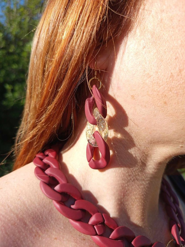 Le collier Nisharakt aux maillons rouge bordeaux, à l’aspect mat et velouté, séduit par son équilibre entre caractère et légèreté. Confortable à porter, il habille le cou avec élégance sans jamais l’alourdir.
