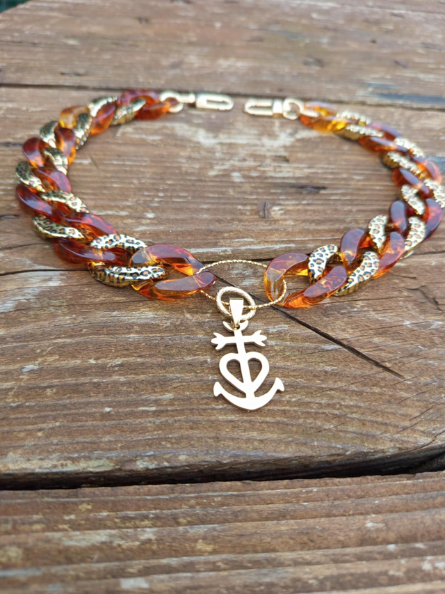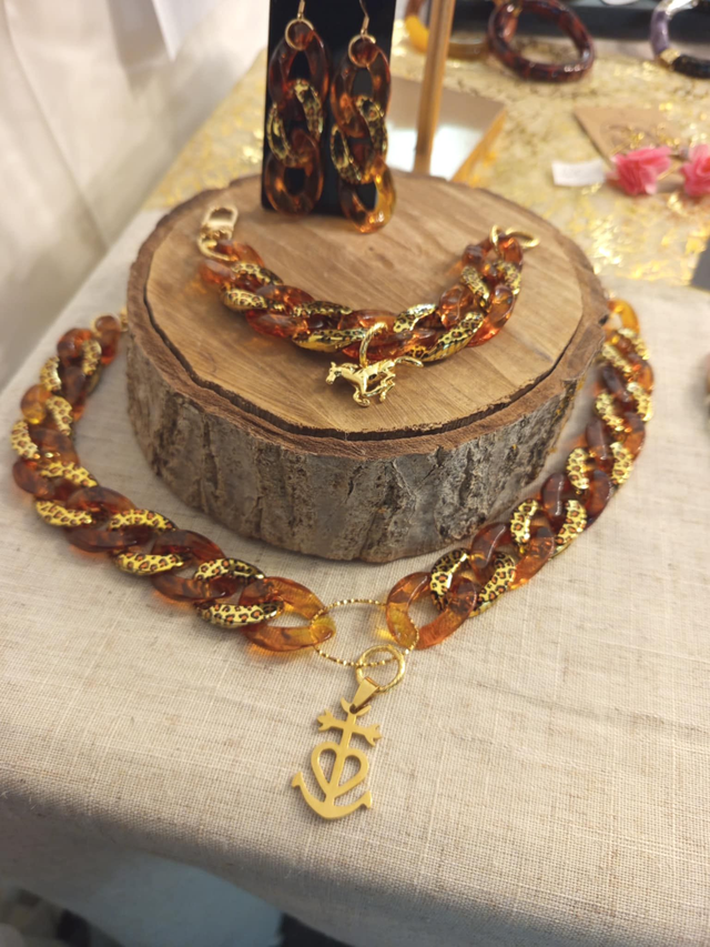 Le collier Prithviya ne passe pas inaperçu. Ses larges maillons à motif léopard imposent leur caractère et apportent une touche sauvage et audacieuse à votre tenue. Les teintes de marron transparent, de doré et de noir offrent un contraste marqué, pour une allure contemporaine et affirmée.