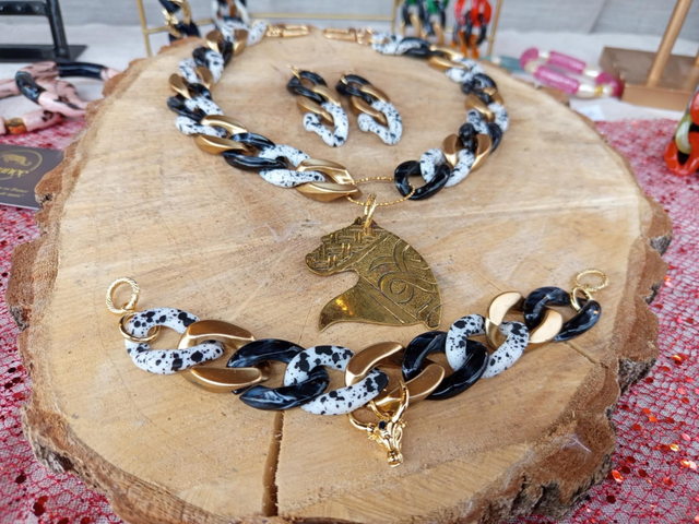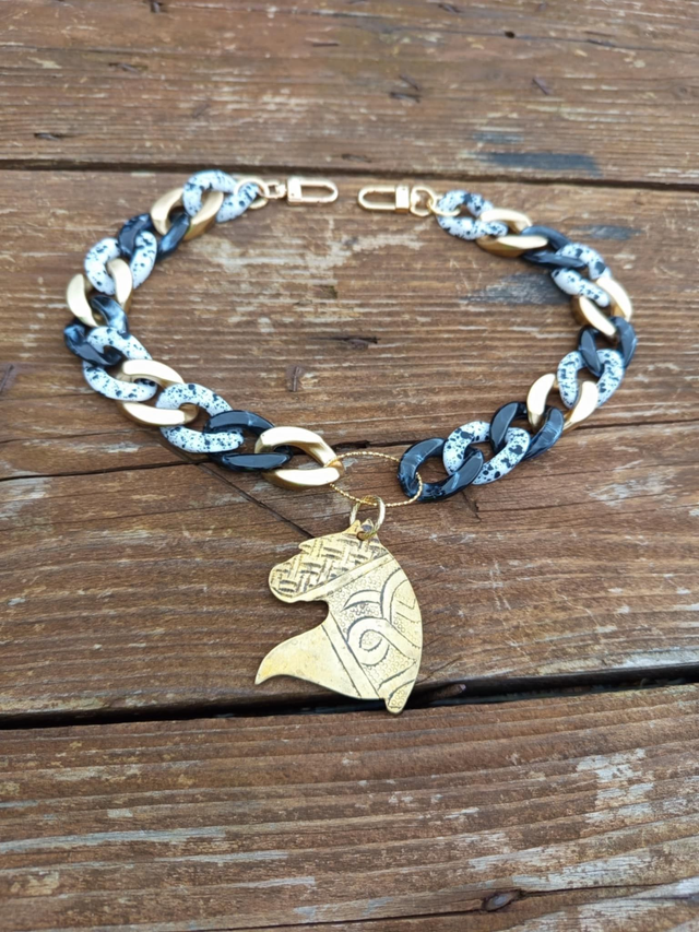 Il est composé de maillons larges aux teintes doré, noir marbré et blanc tacheté de noir, apportant contraste et modernité.