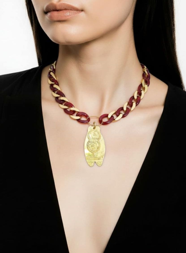 Ses maillons aux nuances dorées et rouge marbré, s’imbriquent avec fluidité. Légers, confortables et facilement ajustables, ils offrent une présence affirmée sans jamais alourdir le port.